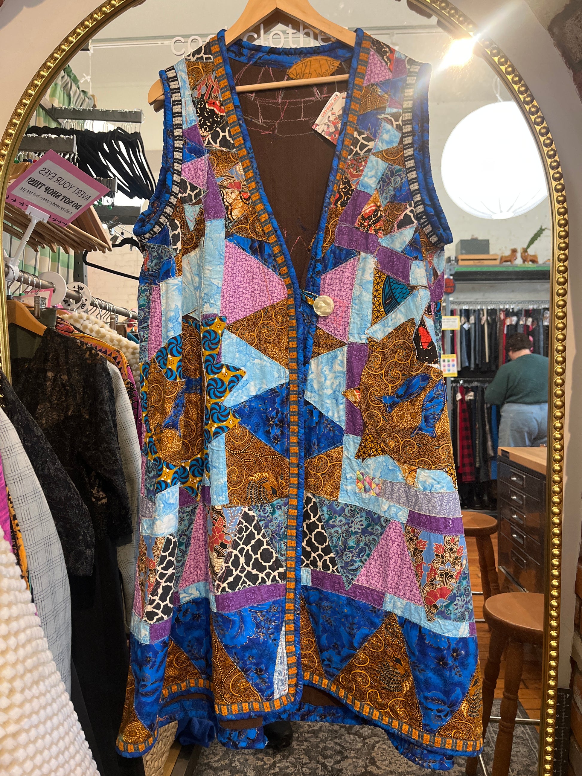 Locally made blue quilted vest jacket Wych Works ONE button