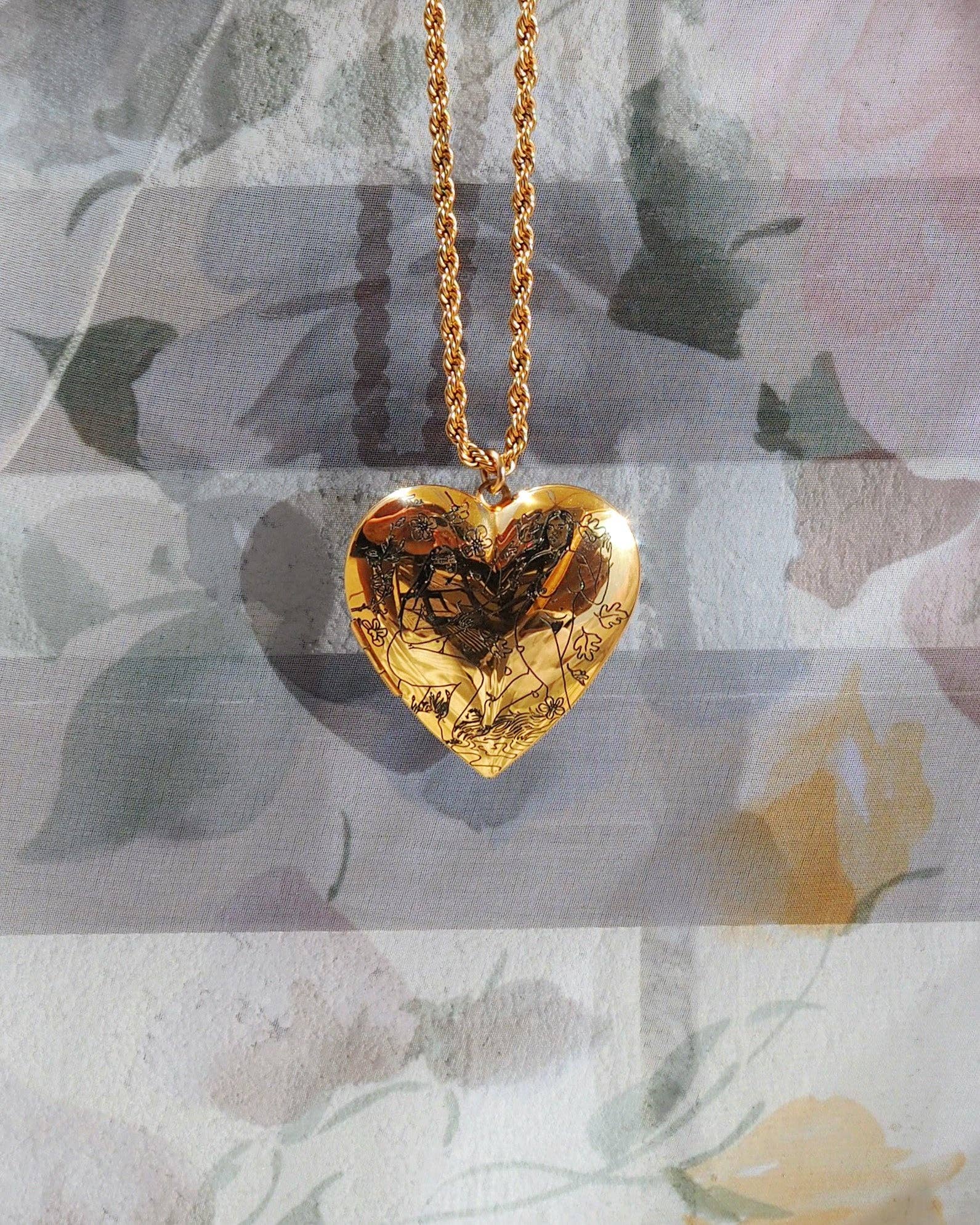 Gold plated stainless steel or stainless steel, depending on the finish, with different delicate black enamel filled CNC etchings on both sides. The locket is 1.65" which is BIG!! It's not too heavy, with lots and lots of space to hide your secrets and spells. Necklaces come in the enchanting reusable "Tender" magnetic cardboard box.