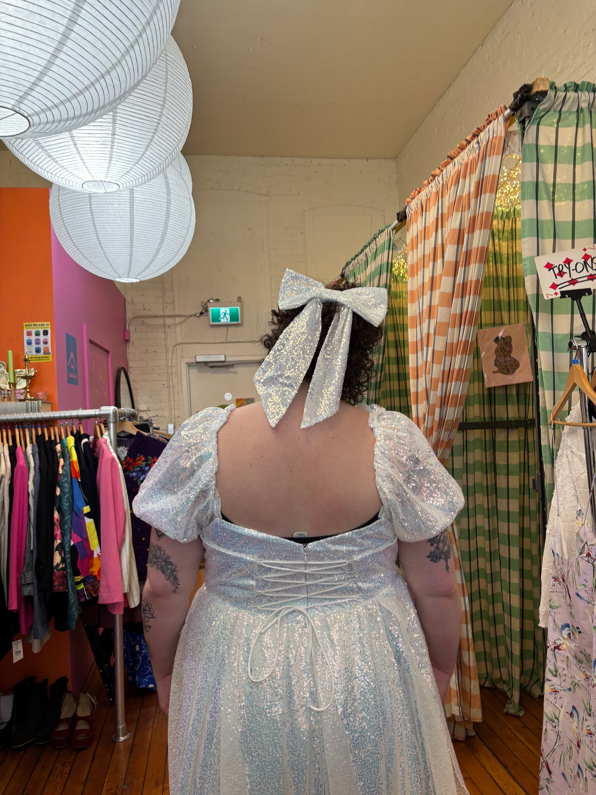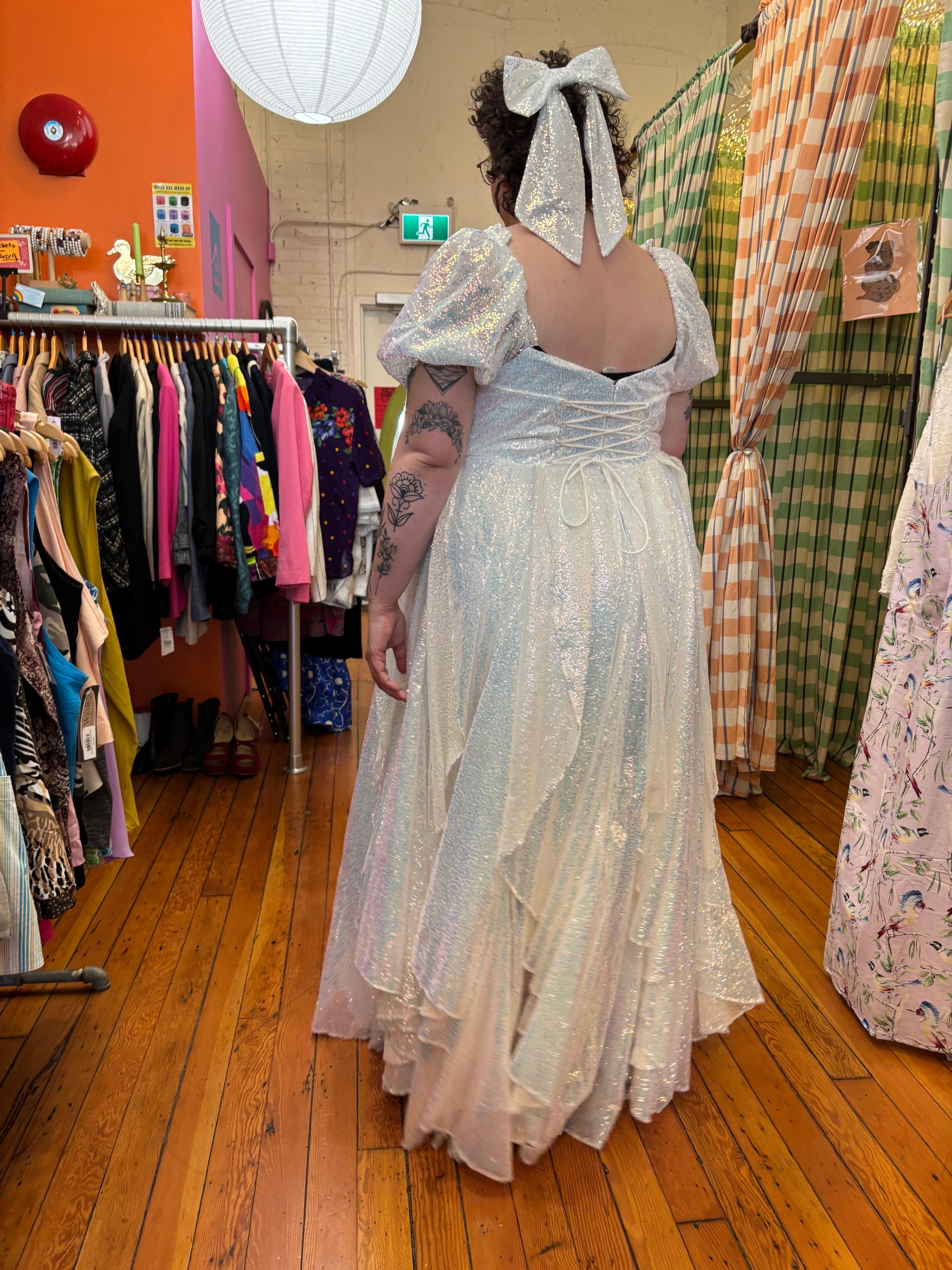 Slip into this otherworldly gown and you will feel instantly illuminated with an ethereal glows that surpasses heaven and all it's angels! Shimmering sequins evoke the mystical tears of unicorns, catching the eye with an ivory hue, and subtle glimmers of pink and baby blue crystal. The full, flowing skirt evokes visions of Pegasus' wings in flight, while face-framing puff sleeves trimmed with ruffles evoke an angelic aura. Built for twirling across ballroom floors, this exquisite gown's subtle glimmering accents and ethereal allure will make you feel like a beautiful goddess riding off to a magical realm of fantasy.