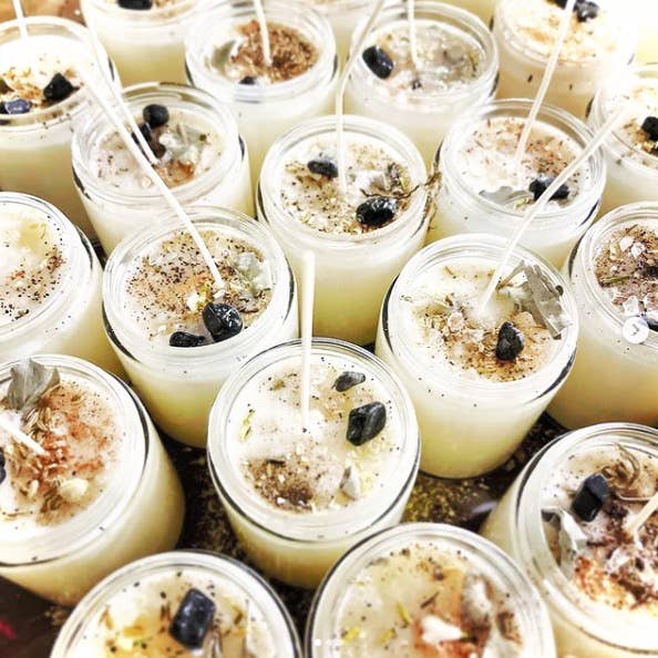 I have been present in places where the energy felt thick and heavy, or spaces that were so full of stagnant negative energy that it seemed almost shrouded by fog. we've all had our down times or lost loved ones , or felt as if outside forces may be working against us. we've all had those days where things just don't go as planned or we feel anxious or afraid. This candle is meant to brighten those dark spots and bring protection, love and powerful energy which surrounds us, banishing the thickness of air and negative feelings, people and outlooks. Meant to be burned morning or evening; light this candle during times of need, when your life needs a little brightness. Most effective leading up to, and during the full moon. Ingredients: bay leaves for protection and clearing eco soy wax clear quartz, a stone of power to amplify intention, to cleanse, to increase spiritual vibration.